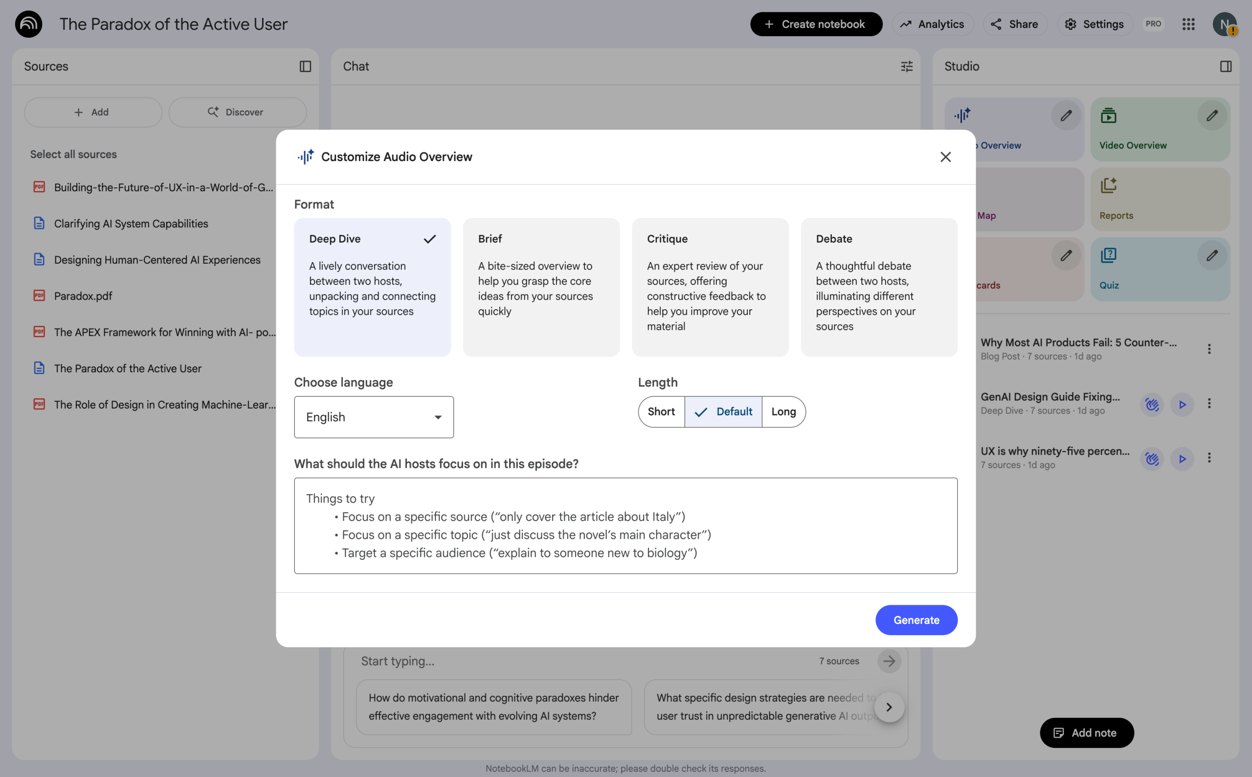To the right of the prompt UI, additional functionality becomes visible. Generate an audio overview. Click the edit icon to see more options for audio. A deep dive, a brief, a critique, a debate. Each time you select an option, the text field below shows suggestions to enhance the output.